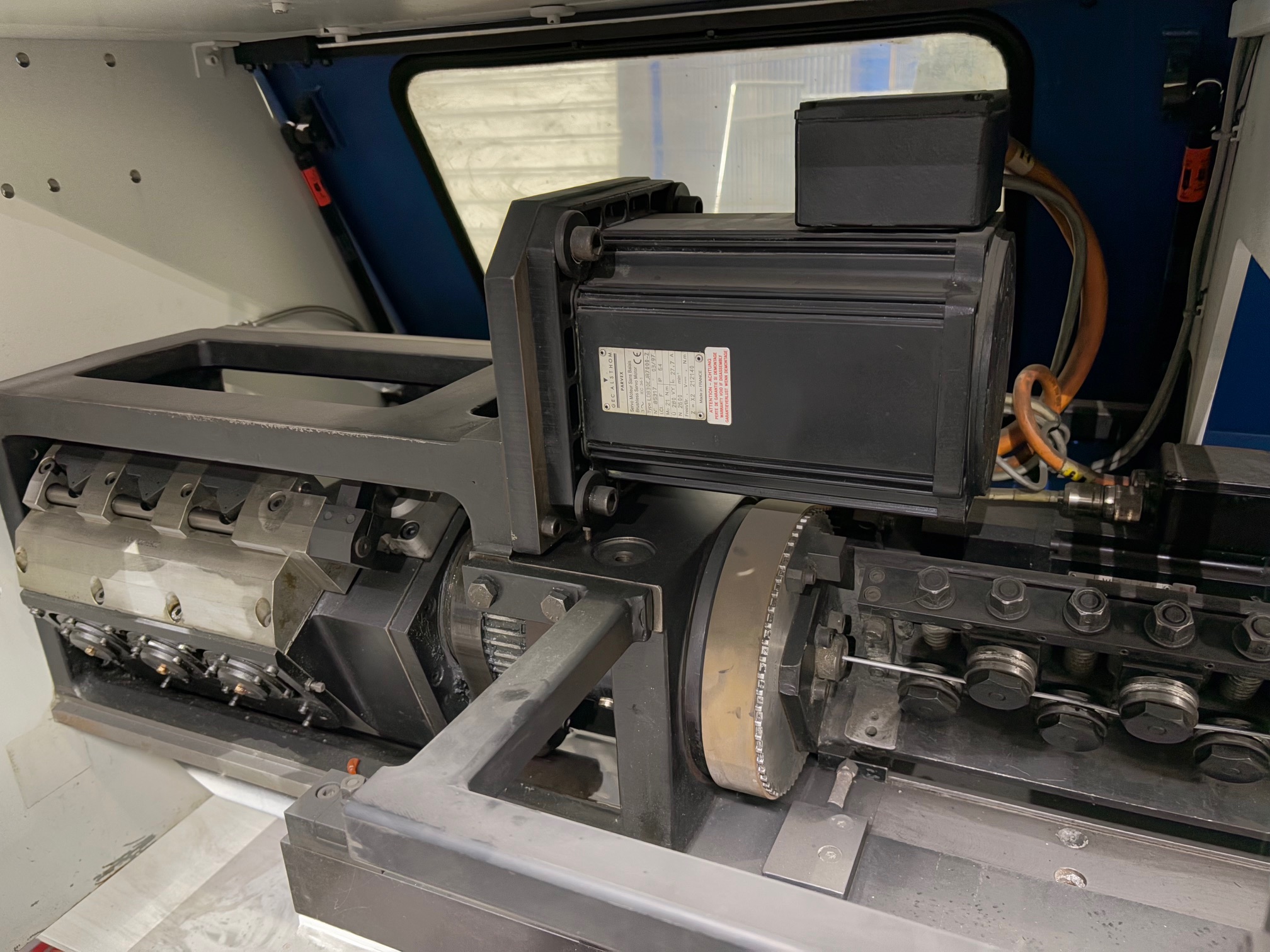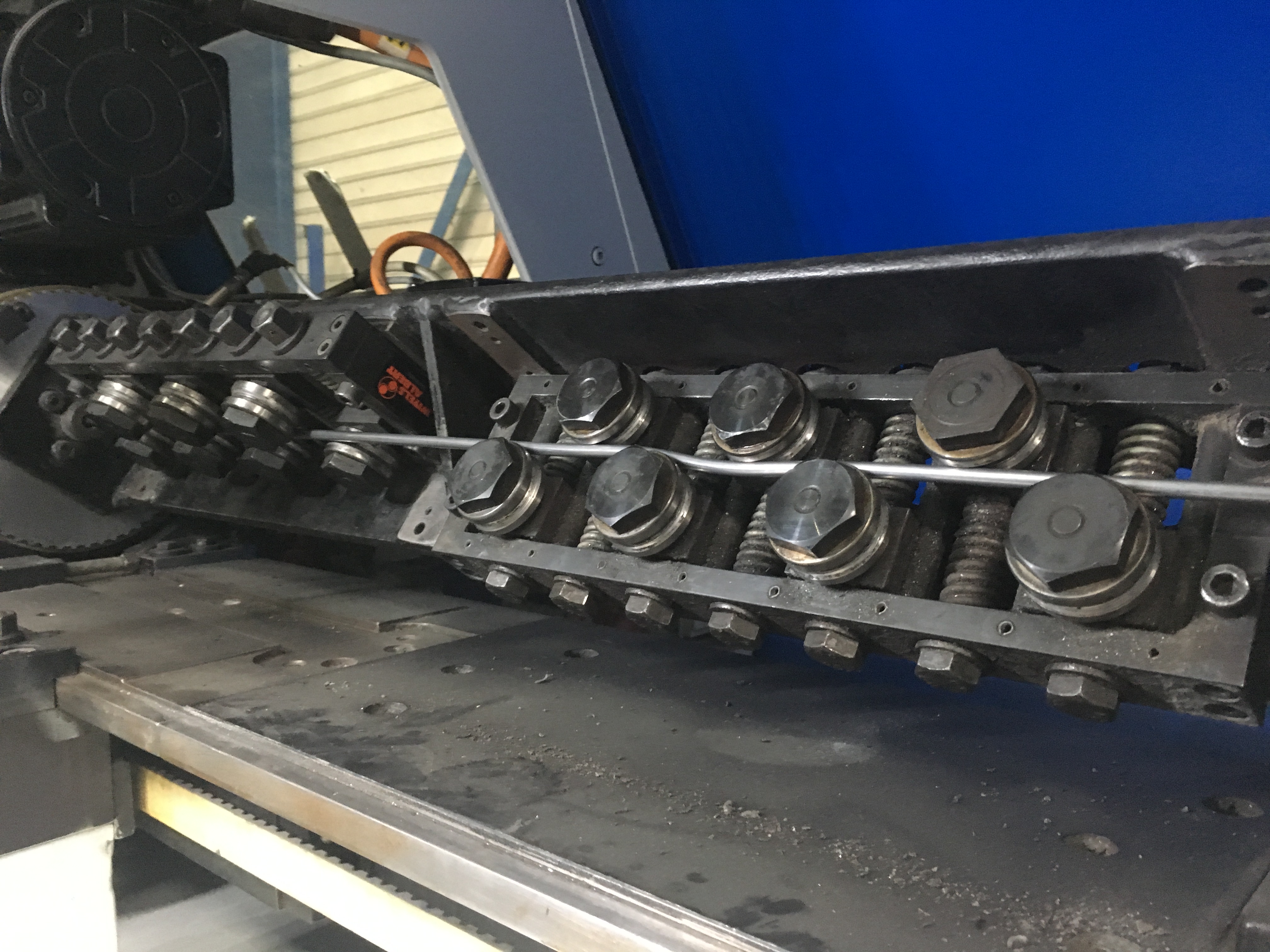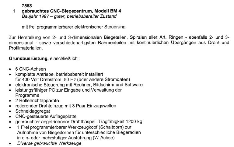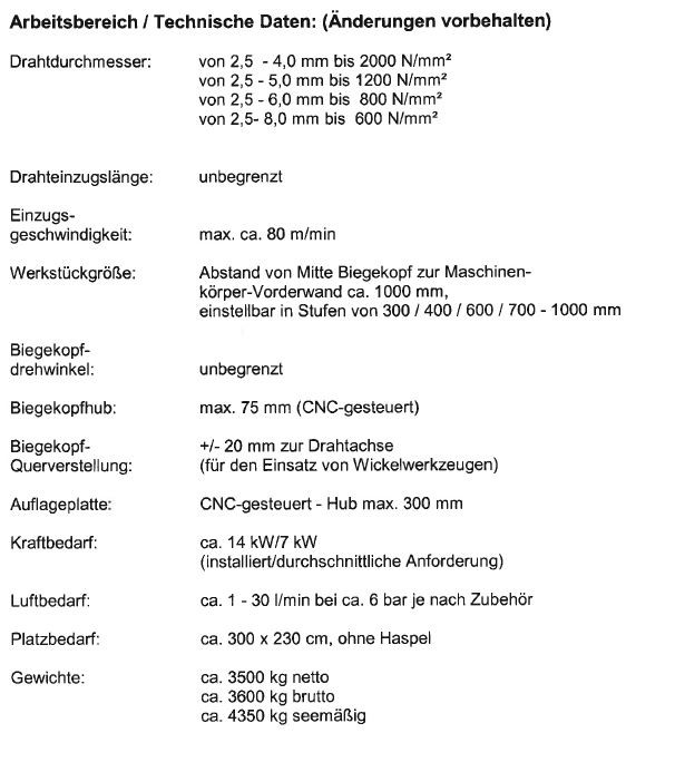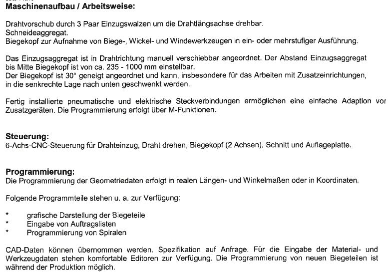 6 CNC-Achsen, Biegekopf 2 Achsen, 2 Rollenrichtapparate, rotierender Drahteinzug mit 3 Paar Einzugswellen, Schneidaggregat, CNC-gesteuerte Auflageplatte, freiprogrammierb. Werkzeugkopf (Schaltdorn) zur Aufnahme des Biegedorns für unterschiedl. Biegeradien in 1- oder mehrstufiger Ausführung (W-Achse)